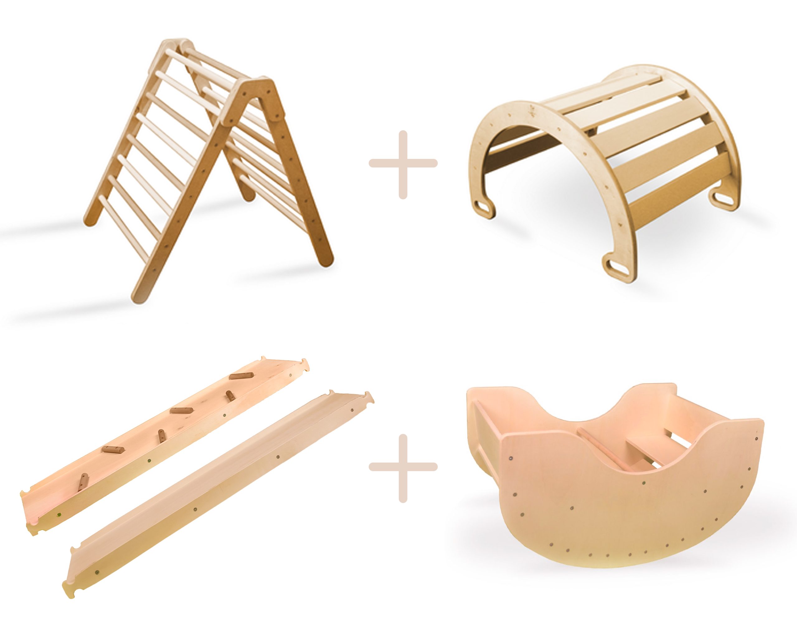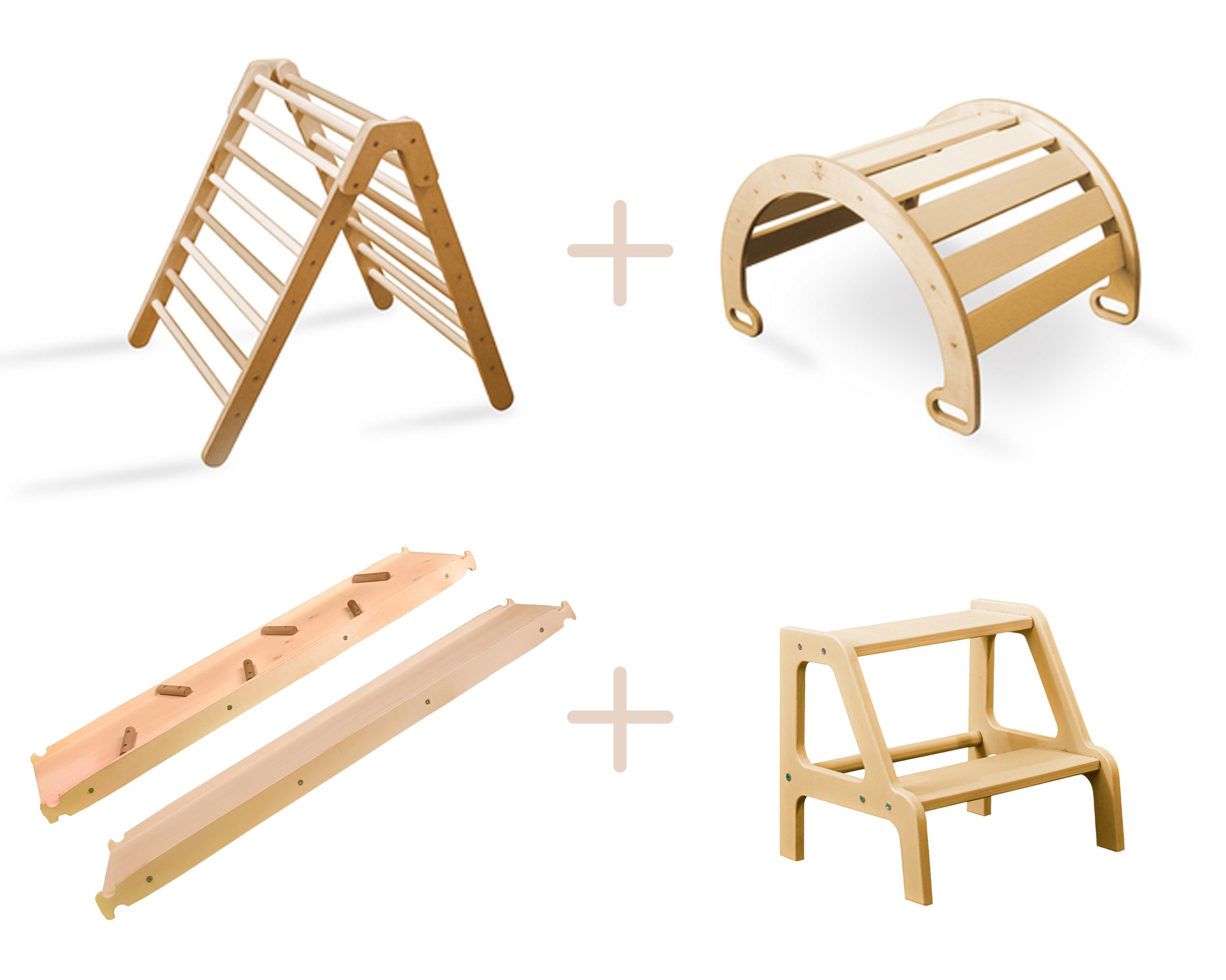 Pikler Sets are functional play sets created by combining different Pikler products, designed to support children’s freedom of movement and active play.